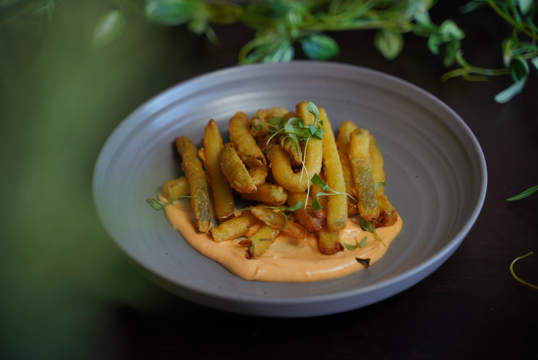 Shaved Brussels with brown butter, pancetta and Parmesan cheese. Served with garlic aioli.