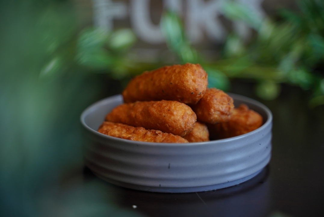 Buffalo Mac N Cheese, breaded in house, crispy bacon and bleu cheese crumbles
