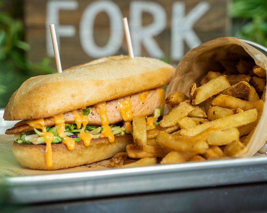 Pan Seared-Salmon with green onion, micro greens, house made slaw and sriracha aioli, on a butter banh mi bun.
