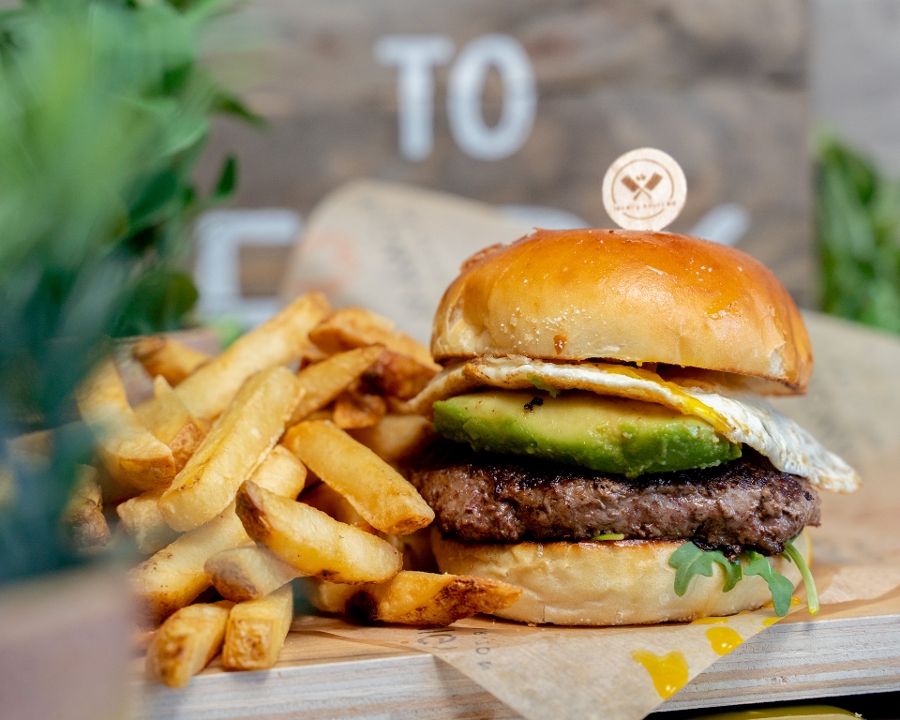 Local egg, thick cut cherry wood smoked bacon, arugula and avocado on a brioche bun.