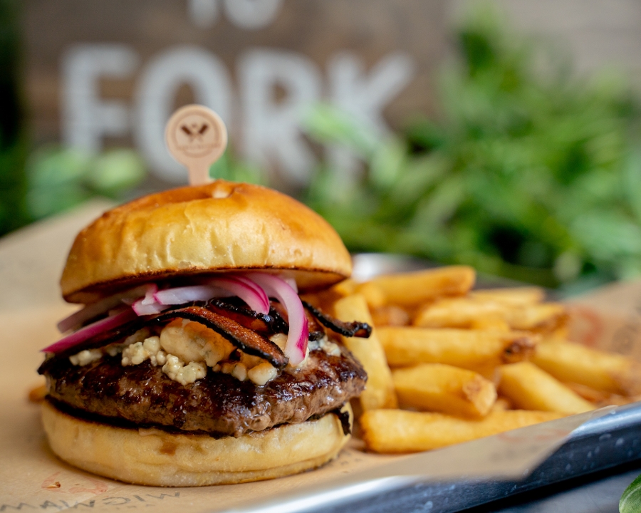 Crumbled bleu cheese, thick cut cherry wood smoke bacon, pickled onion and balsamic mayo.