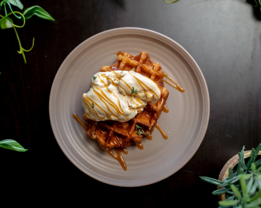 With smoked maple bourbon praline ice cream and caramel sauce.